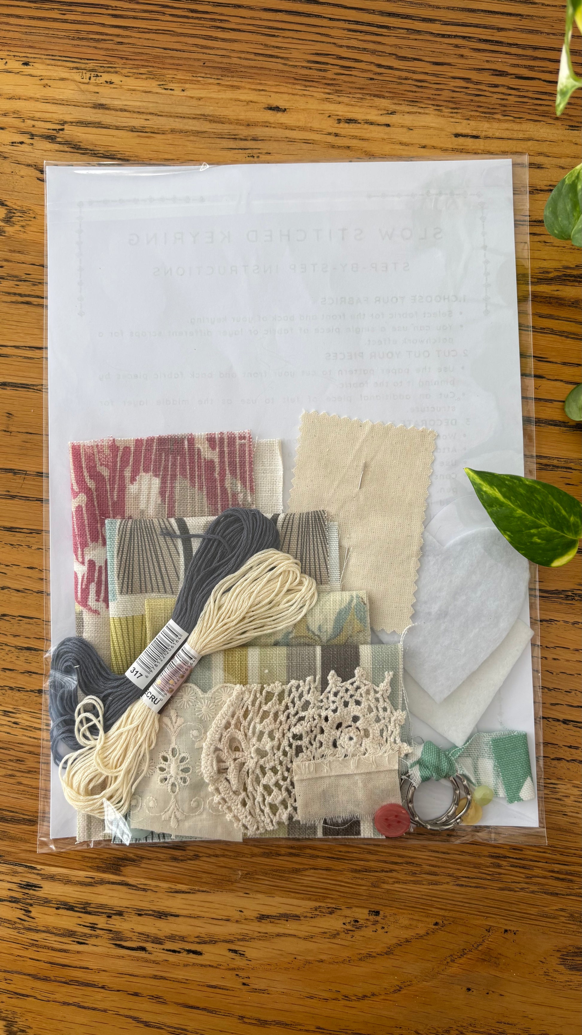 Inside you’ll find fabric pieces, lace, buttons, felt, templates, two embroidery threads, a needle, two keyrings, and easy-to-follow instructions.